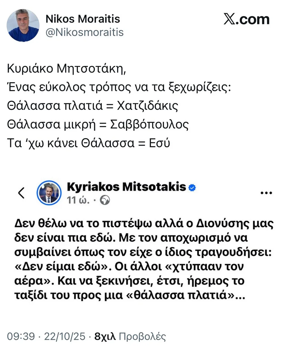 Αφορμή στάθηκε η ανάρτηση του Κυριάκου Μητσοτάκη λίγο μετά τη γνωστοποίηση του θανάτου του Σαββόπουλου, όπου αποχαιρέτησε τον καλλιτέχνη με στίχους από το τραγούδι «Θαλασσογραφία» και τη φράση «φύσα θάλασσα πλατιά». Ορισμένοι χρήστες των κοινωνικών δικτύων —ανάμεσά τους ο στιχουργός Θάνος Μωραΐτης και ο νευροχειρουργός του ΕΣΥ Παναγιώτης Παπανικολάου— ισχυρίστηκαν λανθασμένα ότι ο συγκεκριμένος στίχος ανήκει στον Μάνο Χατζιδάκι.