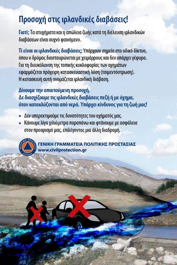 Όπως επισημαίνει, «δεν διασχίζουμε ιρλανδικές διαβάσεις όταν υπάρχει νερό, ακόμη κι αν φαίνεται μικρό το ύψος του. Οι ιρλανδικές διαβάσεις, παρ’ ότι υπό φυσιολογικές συνθήκες είναι ασφαλείς, εντούτοις μετά από έντονες βροχοπτώσεις μπορούν να μετατραπούν σε εξαιρετικά επικίνδυνα σημεία με σοβαρό κίνδυνο παράσυρσης οχημάτων και πεζών».