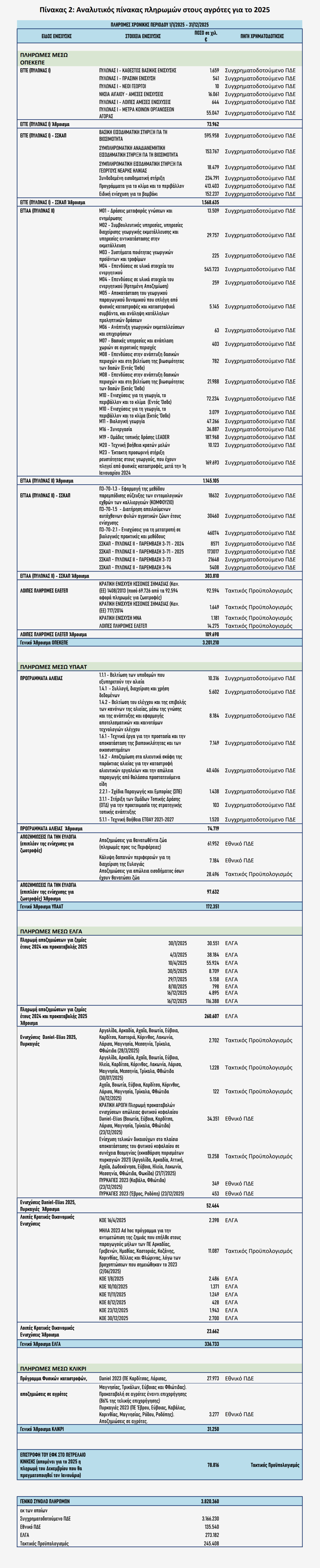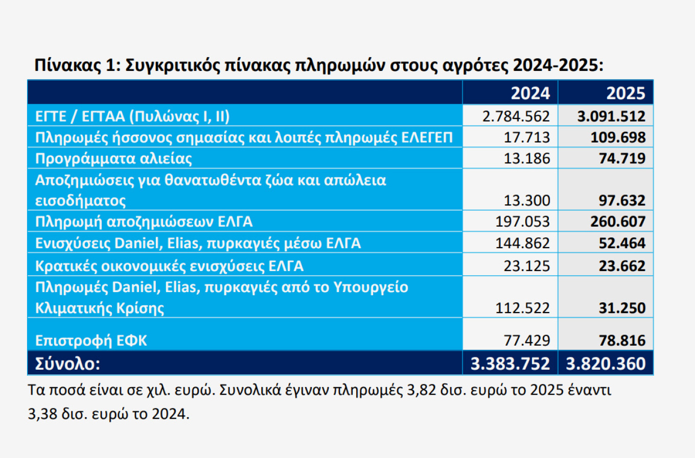 Στο ίδιο πλαίσιο, αναγνωρίζει ευθέως τις διαχρονικές ευθύνες στον ΟΠΕΚΕΠΕ, σημειώνοντας ότι η σημερινή κυβέρνηση είναι η μόνη που τις έχει παραδεχθεί ανοιχτά. Υπενθυμίζει ότι η διαδικασία των πληρωμών επηρεάστηκε από την παρέμβαση της Ευρωπαϊκής Εισαγγελίας, τους ελέγχους της OLAF, τις έρευνες της Οικονομικής Αστυνομίας και τις πολύμηνες διαπραγματεύσεις με τις Βρυξέλλες για τη διαμόρφωση νέου συστήματος. Όπως εξηγεί, για το 2025 εφαρμόζεται ένα υβριδικό σύστημα, ενώ από το 2026 θα ισχύσει οριστικά ένα πλήρως ψηφιακό και διαφανές μοντέλο καταβολής ενισχύσεων. Τα συνολικά κονδύλια από την Ευρωπαϊκή Ένωση για άμεσες ενισχύσεις δεν μειώνονται, αλλά –σύμφωνα με την κυβέρνηση– θα κατανέμονται δικαιότερα, υπέρ των πραγματικών παραγωγών. Στο σημείο αυτό, ο αντιπρόεδρος της κυβέρνησης αφήνει σαφείς αιχμές για αντιδράσεις από όσους ενδεχομένως επωφελούνταν από στρεβλώσεις του παρελθόντος. Όπως αναφέρει, για χιλιάδες υποθέσεις τα στοιχεία έχουν δεσμευτεί από την Οικονομική Αστυνομία, ενώ χιλιάδες ΑΦΜ βρίσκονται υπό διασταύρωση. Εκτιμά πάντως ότι η μεγάλη πλειονότητα των αγροτών θα ωφεληθεί από το νέο σύστημα.