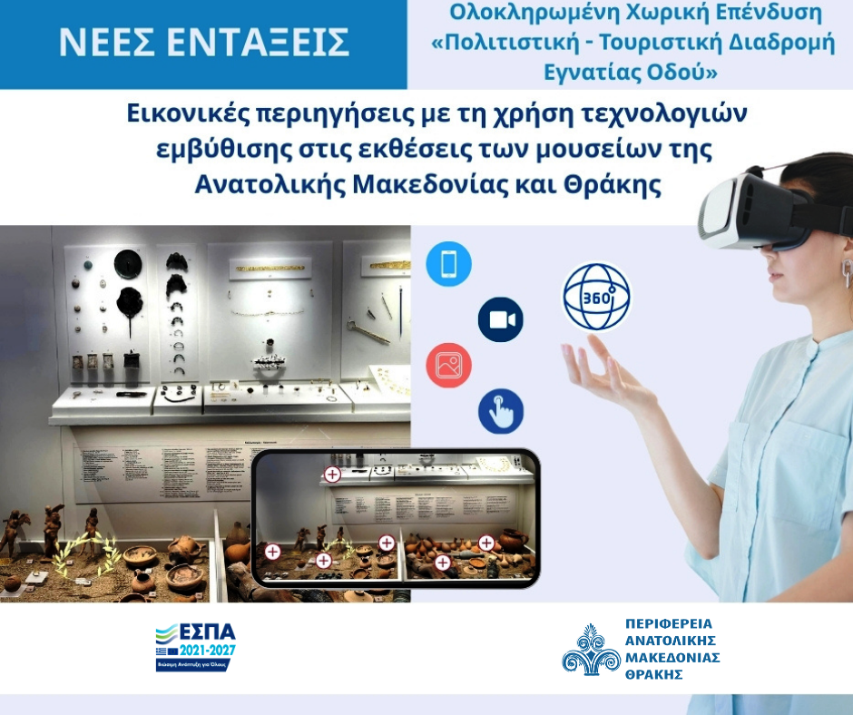 Με απόφαση του Περιφερειάρχη Ανατολικής Μακεδονίας και Θράκης, Χριστόδουλου Τοψίδη, η Ολοκληρωμένη Χωρική Επένδυση (ΟΧΕ) «Πολιτιστική – Τουριστική Διαδρομή Εγνατίας Οδού» με τίτλο «Εικονικές περιηγήσεις με τη χρήση τεχνολογιών εμβύθισης στις εκθέσεις των μουσείων της Ανατολικής Μακεδονίας και Θράκης», συνολικού προϋπολογισμού 1.311.360 ευρώ, θα χρηματοδοτηθεί από το Επιχειρησιακό Πρόγραμμα «Ανατολική Μακεδονία-Θράκη 2021-2027» (ΕΣΠΑ) με συγχρηματοδότηση και από το Ευρωπαϊκό Ταμείο Περιφερειακής Ανάπτυξης.