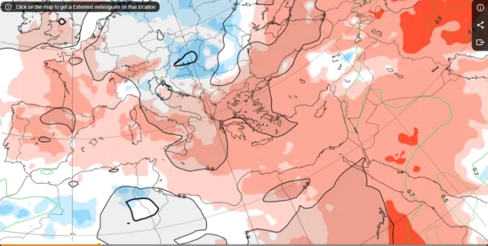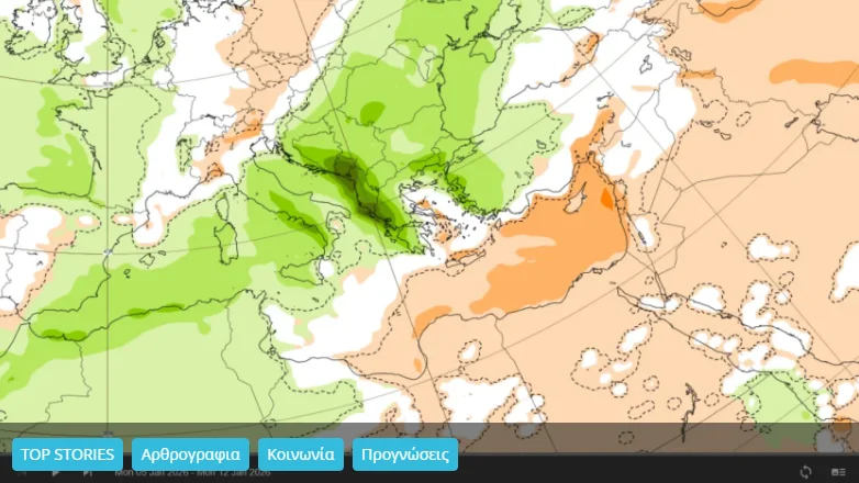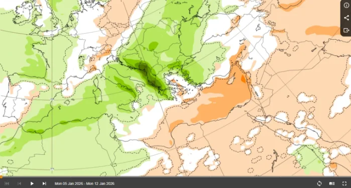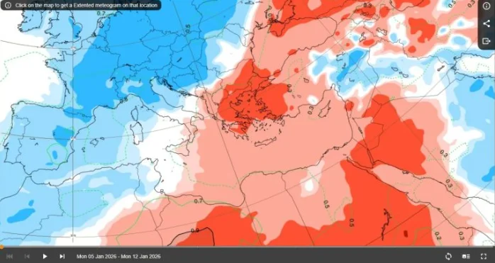 Κατά το διάστημα από 5 έως 12 Ιανουαρίου, η Ελλάδα τοποθετείται ξεκάθαρα στη ζώνη των θετικών θερμοκρασιακών αποκλίσεων. Οι θερμοκρασίες θα παραμείνουν υψηλότερες από τα κλιματικά δεδομένα της εποχής, με τη διαφορά να γίνεται πιο αισθητή στο Αιγαίο, την Κρήτη και τα ανατολικά ηπειρωτικά. Οι βροχοπτώσεις θα εμφανίζουν αυξημένη πιθανότητα σε σχέση με τα κανονικά επίπεδα, κυρίως στο Ιόνιο, τη δυτική και κεντρική ηπειρωτική χώρα και κατά τόπους στο Αιγαίο. Ωστόσο, δεν πρόκειται για παρατεταμένη κακοκαιρία, αλλά για διαδοχικά περάσματα διαταραχών δυτικού τύπου, με ενδιάμεσα διαστήματα βελτίωσης.