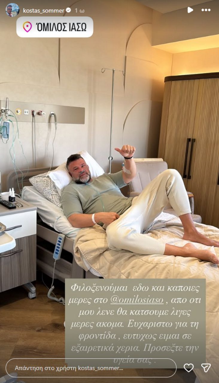 «Φιλοξενούμαι εδώ και κάποιες μέρες στο νοσοκομείο, από ό,τι μου λένε θα κάτσουμε λίγες μέρες ακόμα. Ευχαριστώ για τη φροντίδα, ευτυχώς είμαι σε εξαιρετικά χέρια. Προσέξτε την υγεία σας», έγραψε ο Κώστας Σόμμερ.